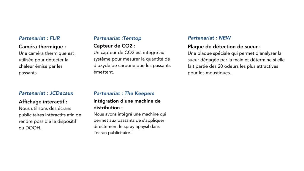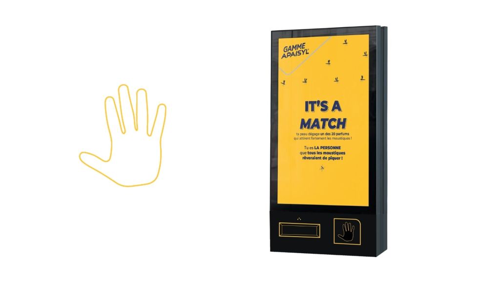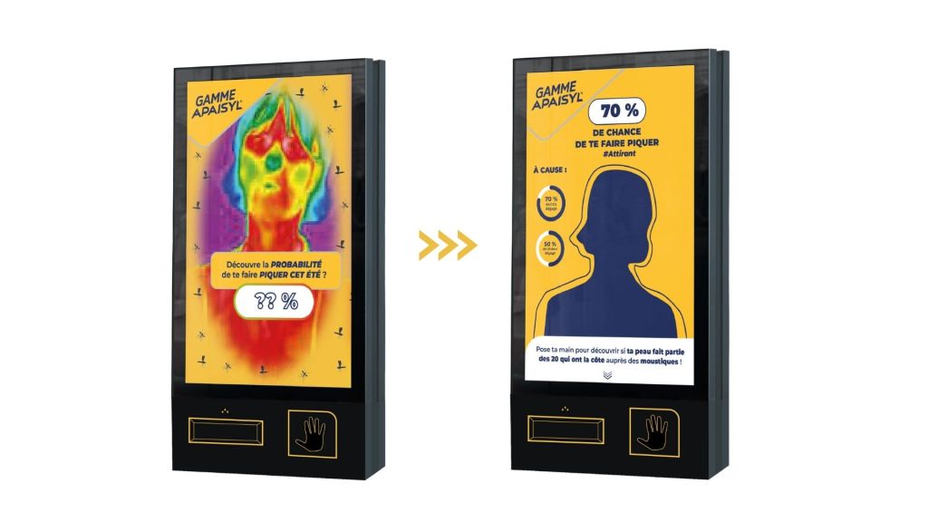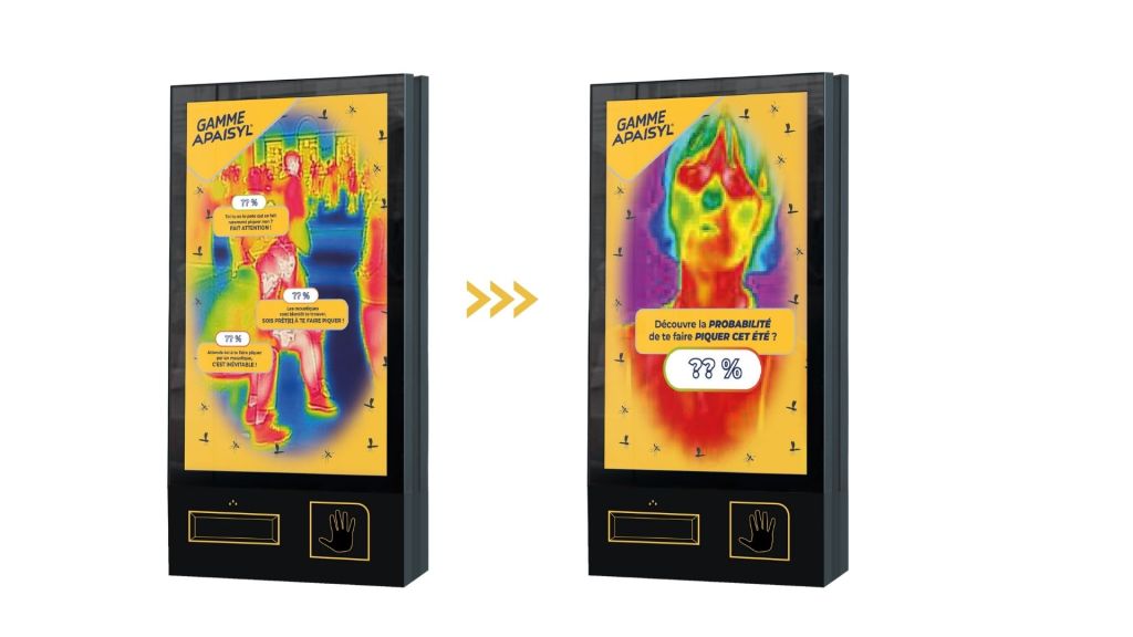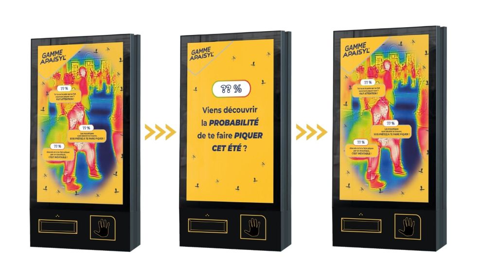 Le DOOH Apaisy vise à informer la cible sur la probabilité de se faire piquer par les moustiques cet été. Pour réaliser cette analyse le panneau publicitaire va être composé d’une caméra infrarouge pour détecter la chaleur corporel des passants, d’un capteur de CO2 pour observer le taux de CO2 dégagé pour les passants et enfin une plaque de détection de sueur. Cette plaque de détection fait partie des innovations du concept. Cette plaque permet de déterminer si la sueur d’une personne fait partie des 20 types les plus attractifs pour les moustiques. Grâce à ces informations, nous calculons la probabilité de piqûre. A la fin de l’opération l’écran affiche le pourcentage de se faire piquer avec le produit Apaisyl, réduit à 1%.